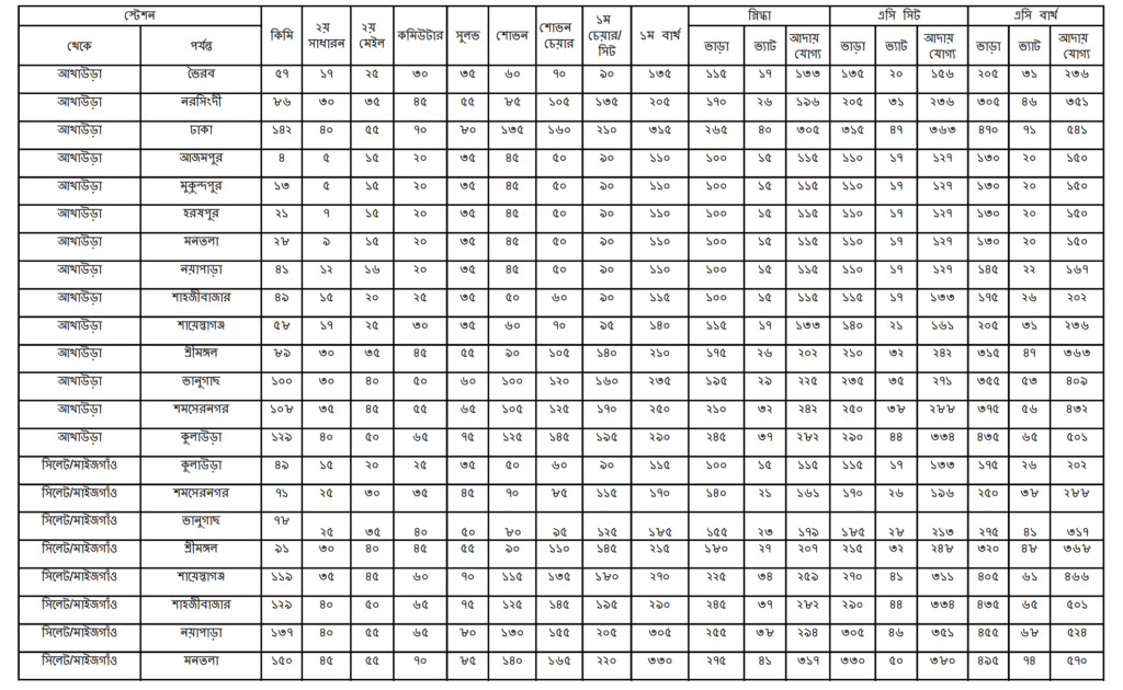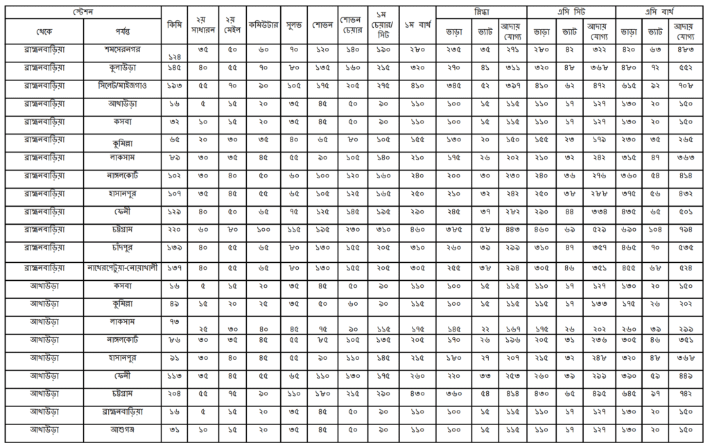 আখাউড়া স্টেশনের ট্রেনের বর্তমান ভাড়ার তালিকা