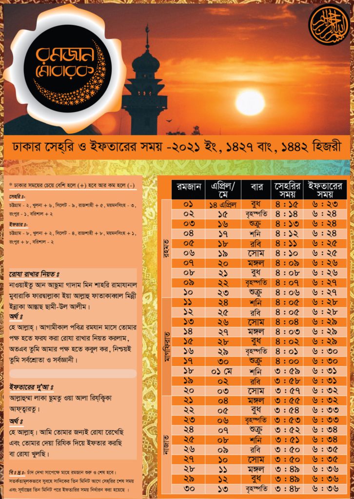 মাহে রমজান ২০২১, আজকের সেহরি ও ইফতারের সময়সূচি, ২০২১ সালের রোজার ক্যালেন্ডার, সেহরি ও ইফতারের সময়সূচি ২০২১, রমজানের ক্যালেন্ডার ২০২১, Ramadan 2021, রমজান ২০২১, রোজার সময়সূচি ২০২১, পহেলা রমজান ২০২১।